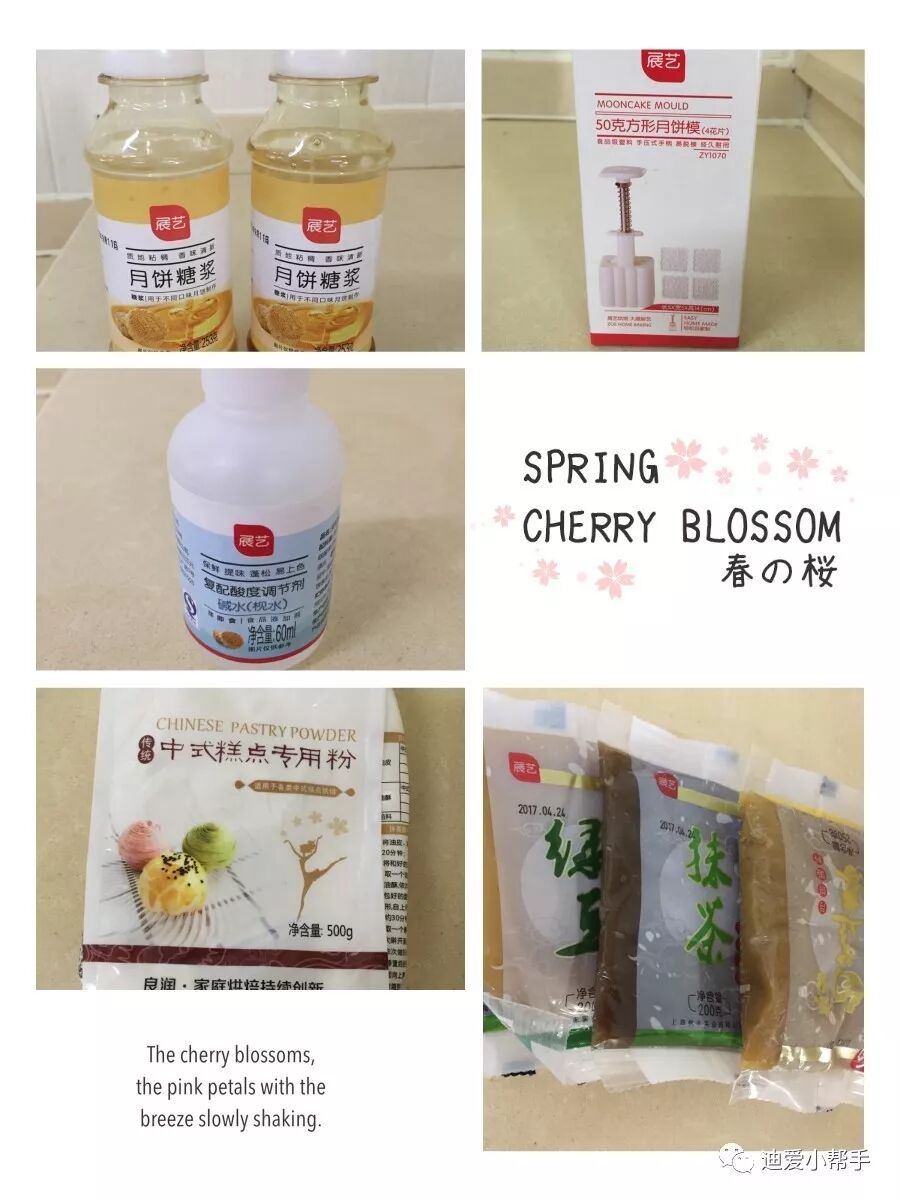 首先要准备好制作月饼的材料,有糖浆、面粉、植物油、月饼模具、碱水、还有各种口味的馅料。