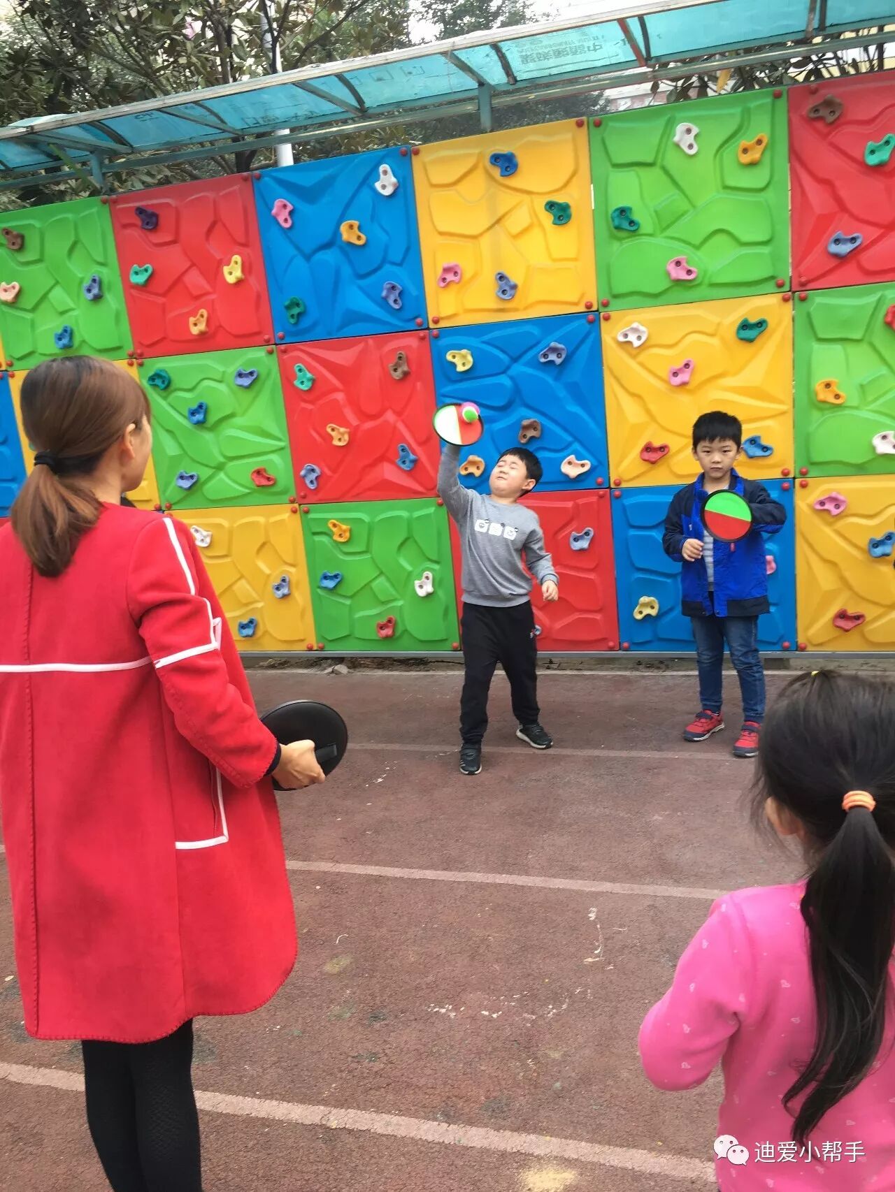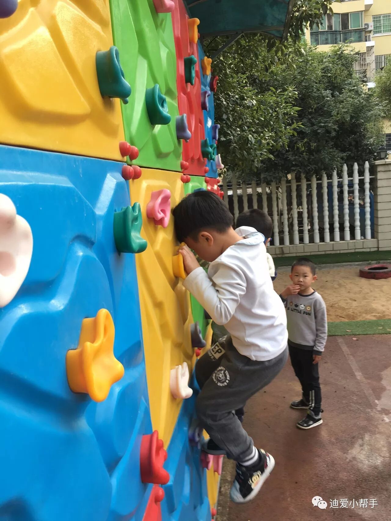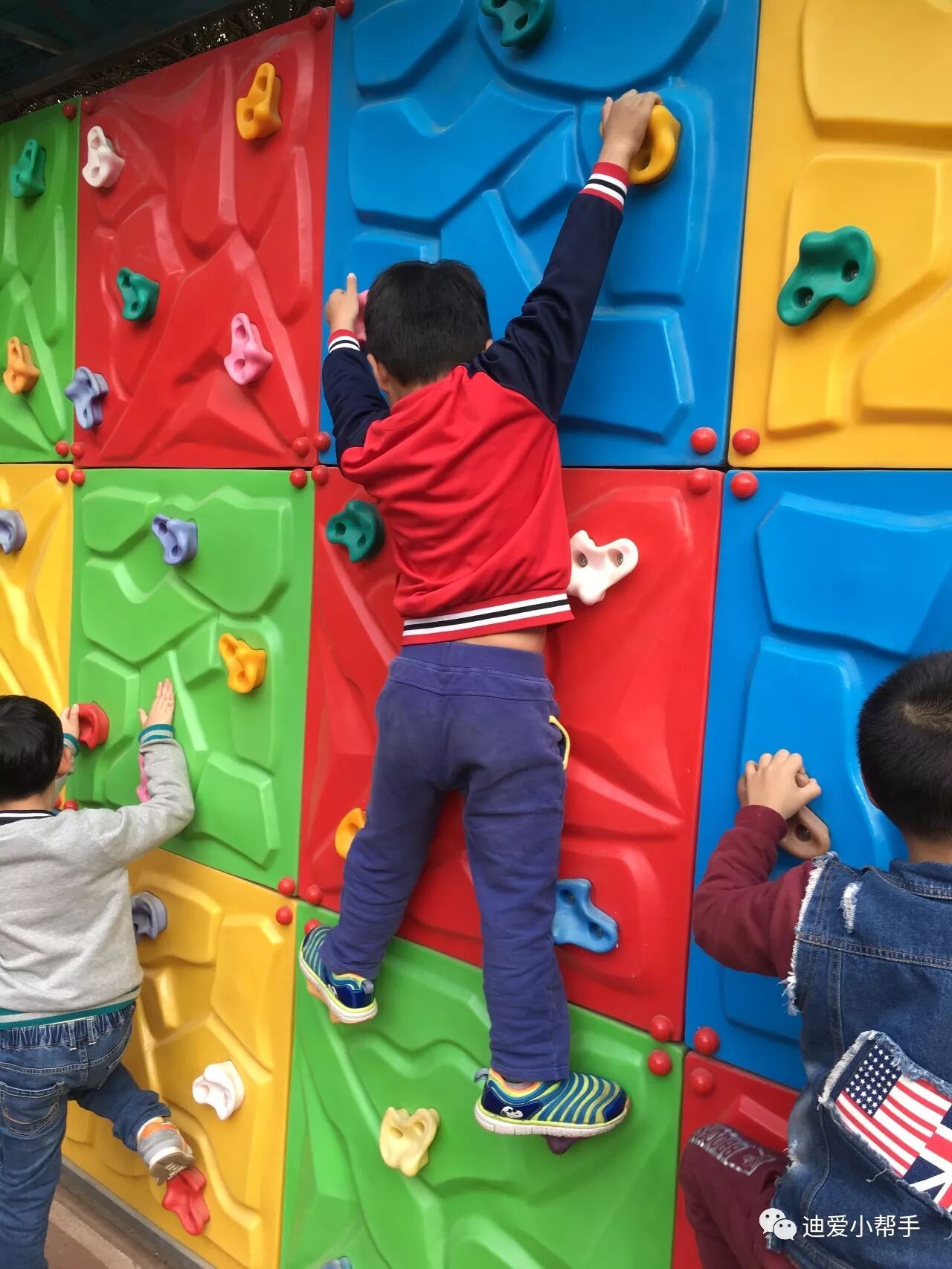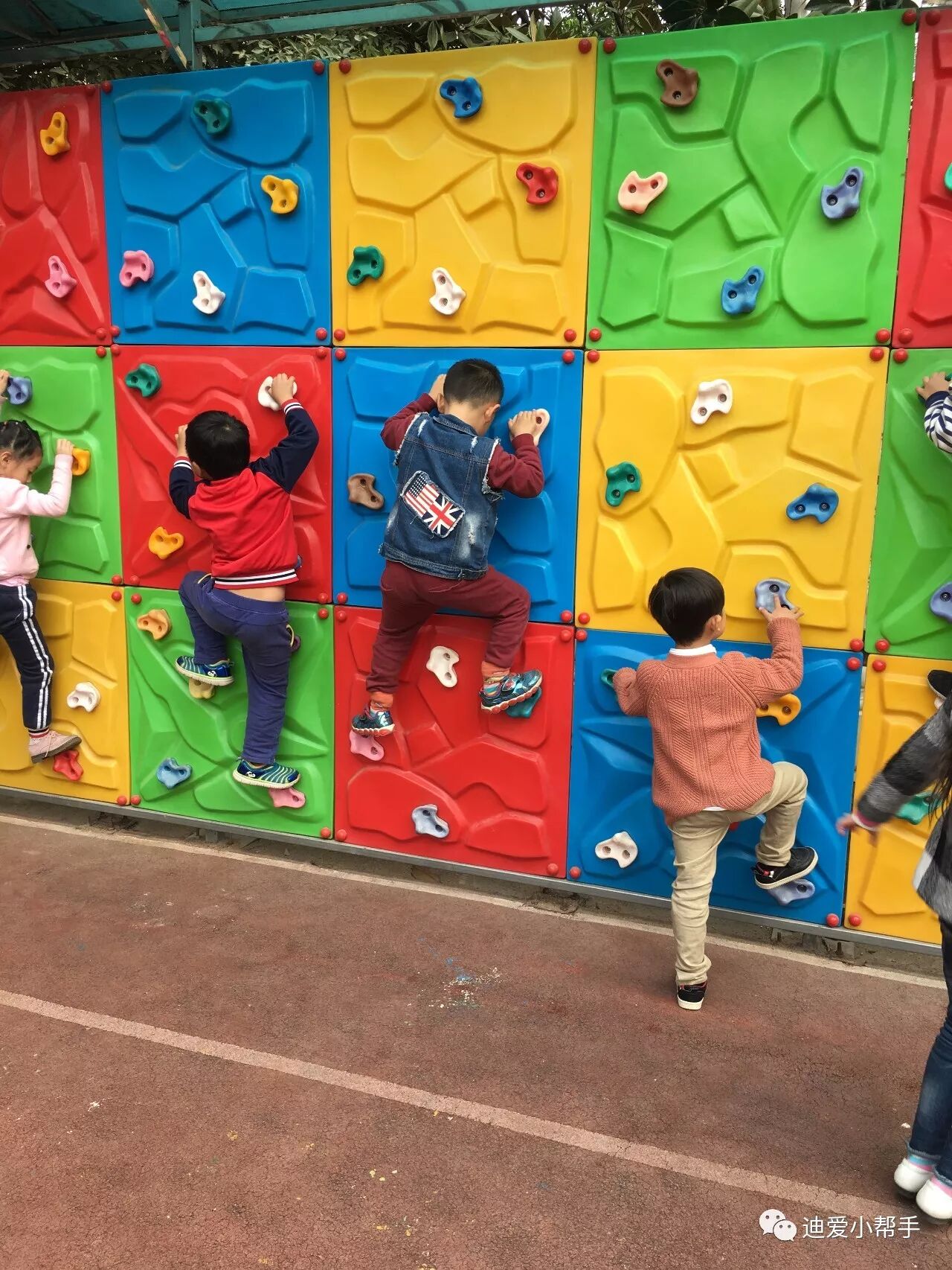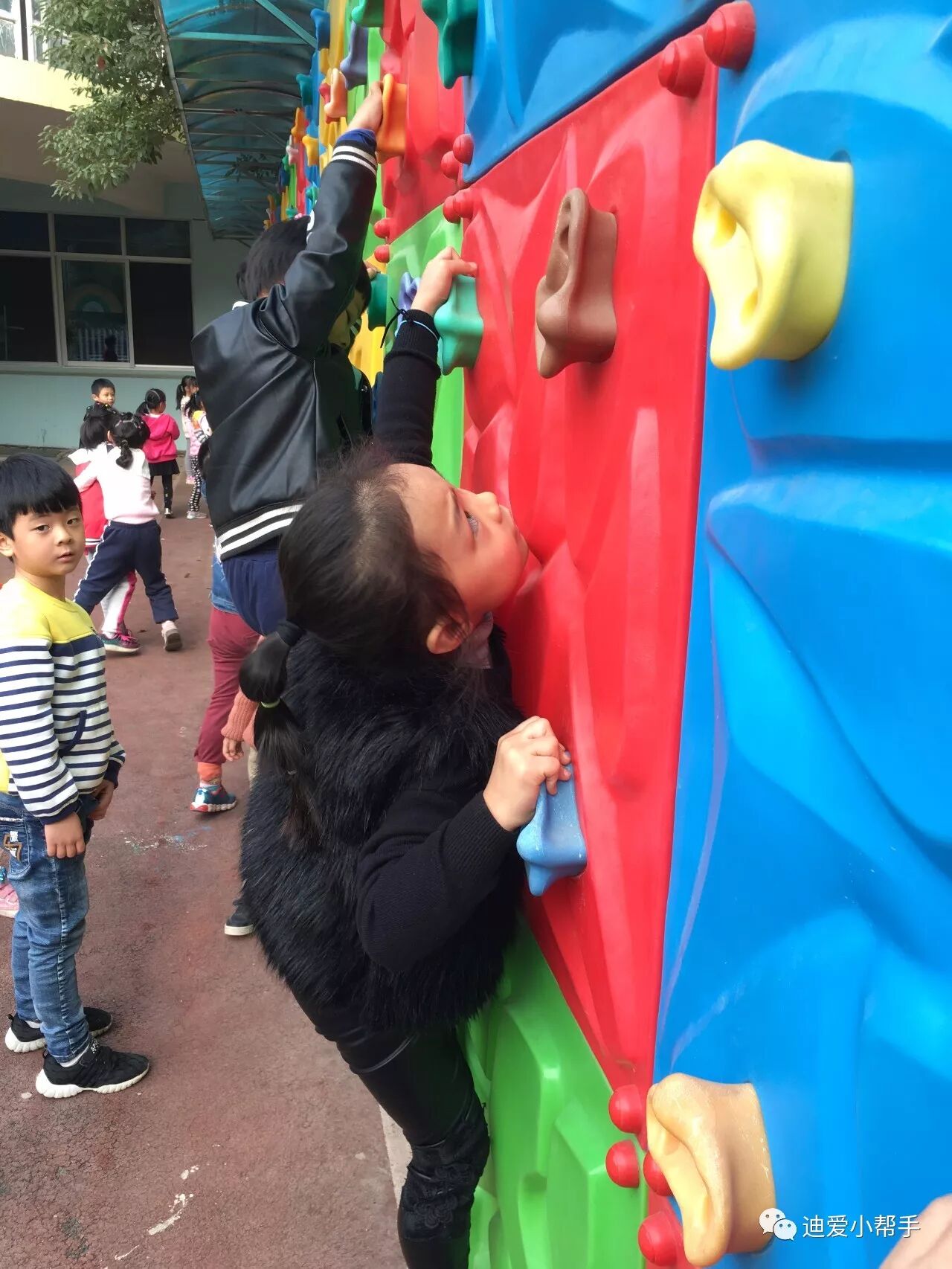 攀爬墙:这可难不倒我们!这需要我们手脚并用,慢慢的向上攀爬哦。瞧!我们像不像"蜘蛛侠"!