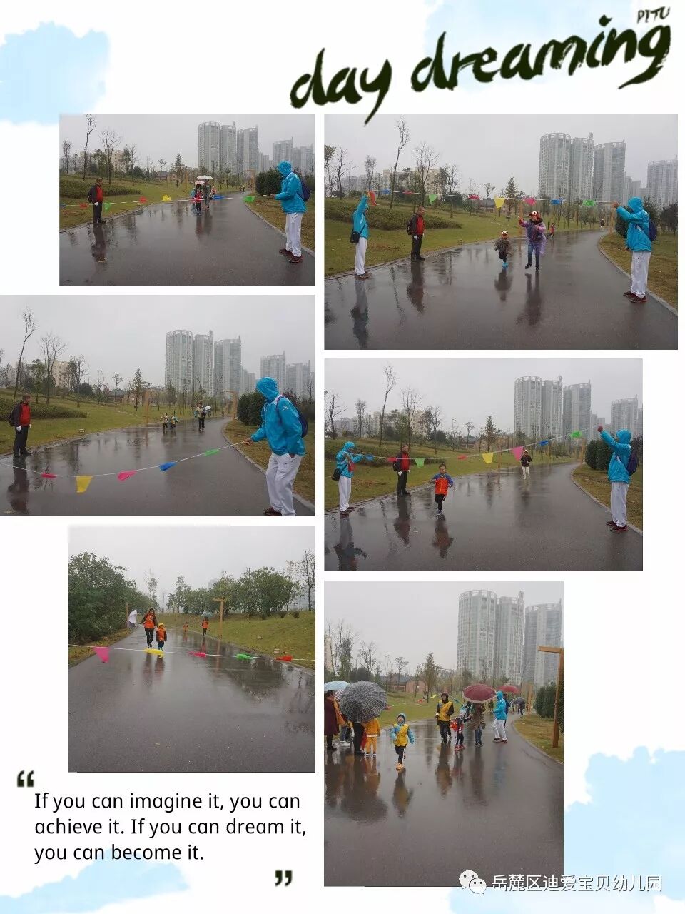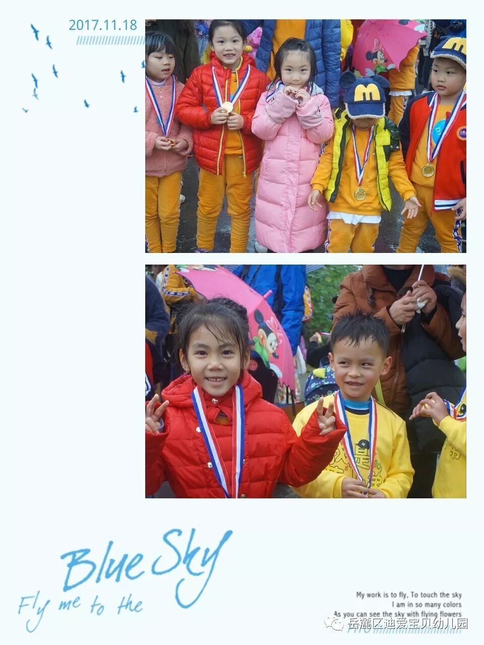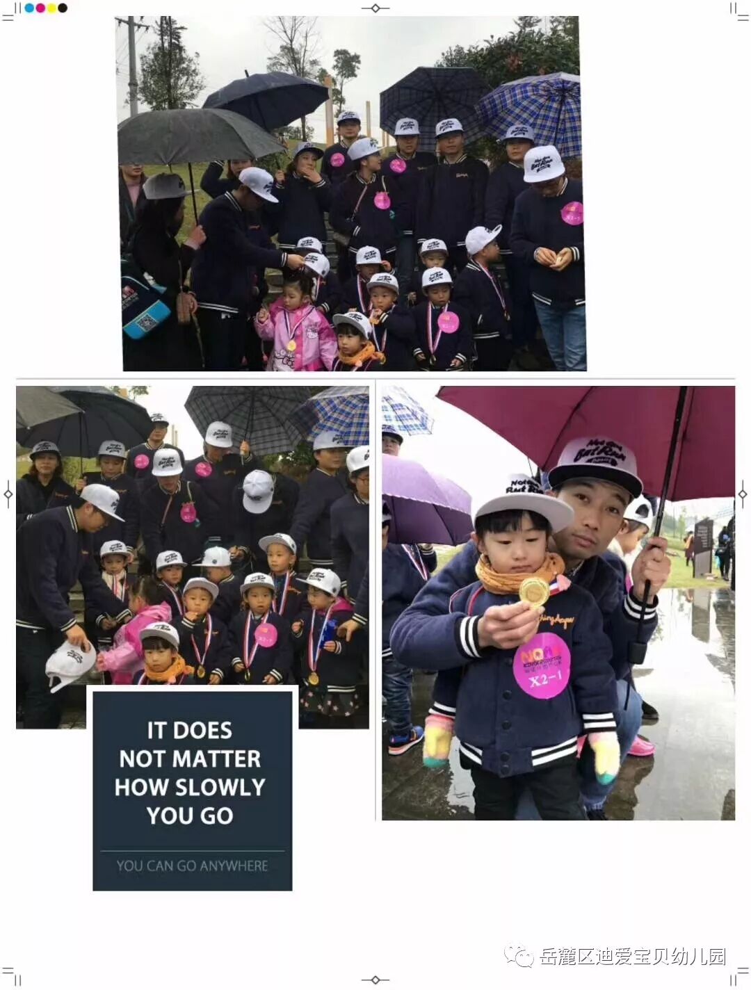 孩子们,穿上小雨衣,行走和奔跑在路上, 通过努力和坚持,他们到达了胜利的终点,赢得了胜利的奖牌。她们勇敢、乐观、坚强,相信未来的她们也将能战胜自我,不怕困难,勇往直前的去面对未知的世界,感受世界的美好。
