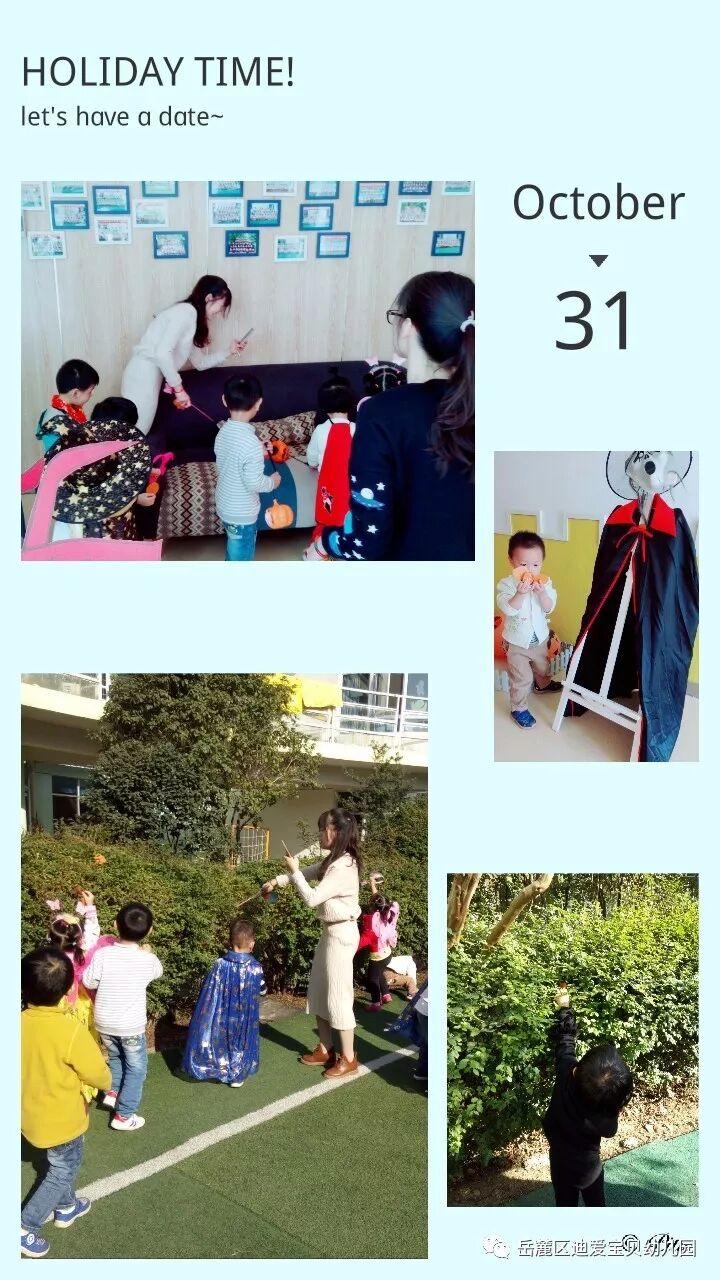 10月31日为了让孩子感受世界文化的丰富多彩,开拓孩子们的国际视野,迪爱宝贝幼儿园在这个充满神秘色彩的节日里,结合英语主题特色展开了形式多样的万圣节活动。