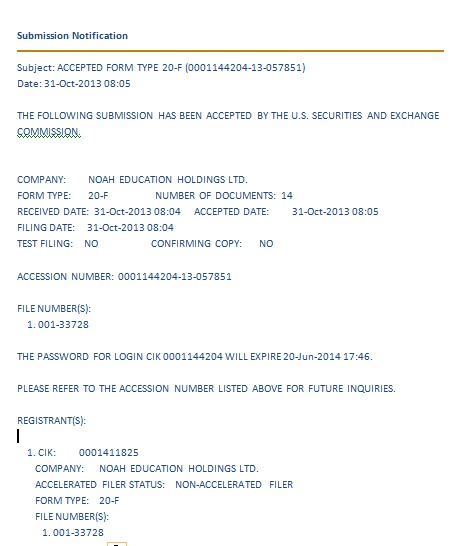 诺亚舟2013财年年报20F已于美国东部时间2013年10月31日股市收盘后向SEC提交,具体信息请参考公司投资者关系网站:http://ir.noaheducation.com。